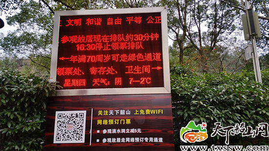 2015年,故居景区实现免费WIFE的全覆盖,方便观众使用移动设备实现智慧参观。在故居等候区设置了讲解服务台,为观众提供介绍和引导,在较短的参观时间内,将展览精髓传递给观众。在观众等候区设置LED电子显示屏,让观众在排队过程中先通过视频预先了解故居展示内景和相关内容,起到缓解游客排队焦虑、疏散游道游客拥堵、加深游客参观印象等多重作用,体现智慧化管理、人性化服务。